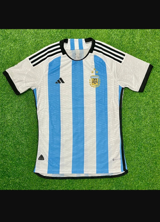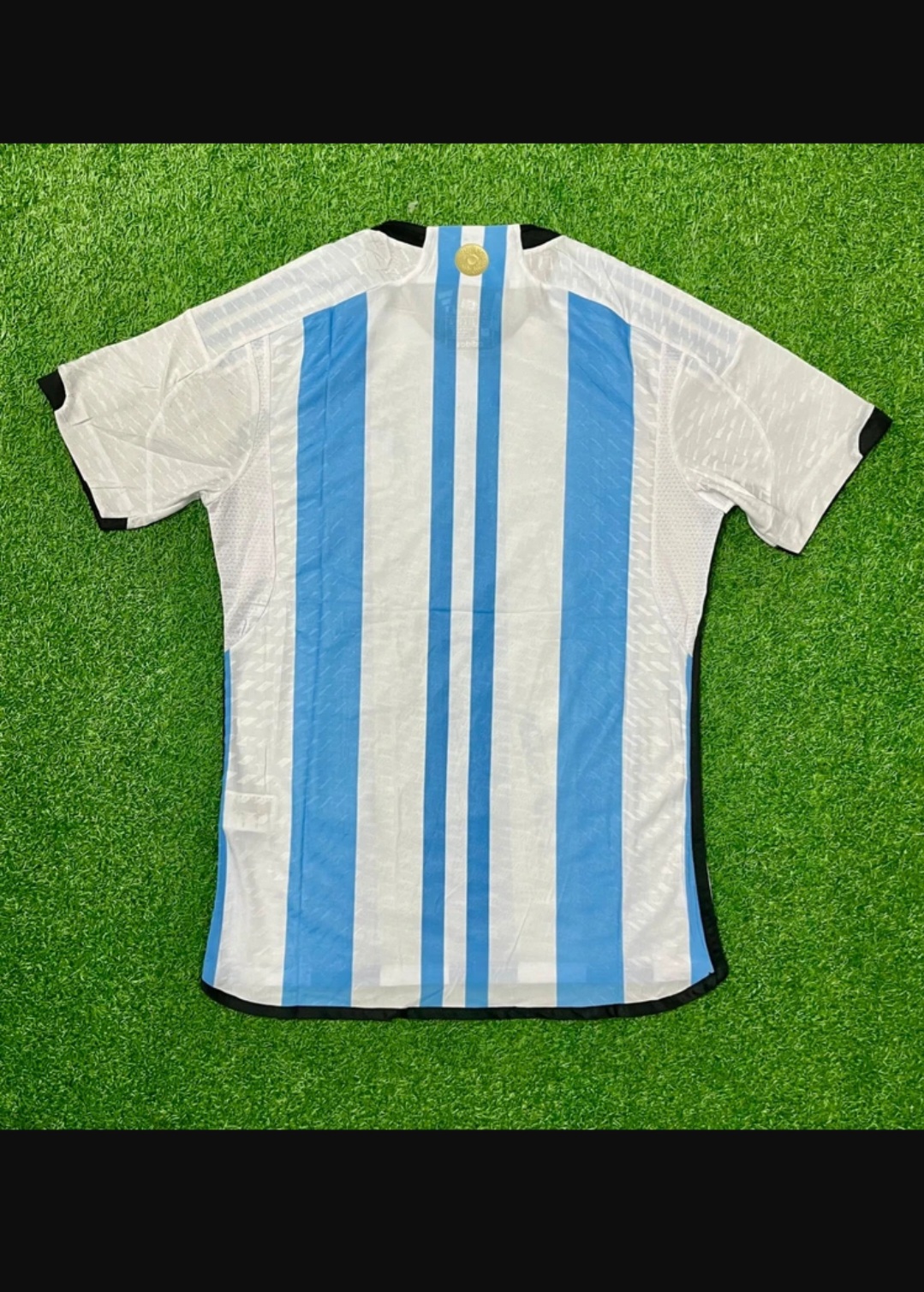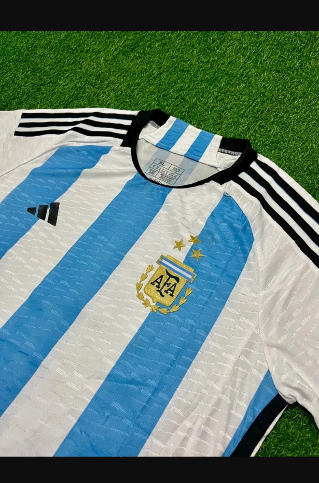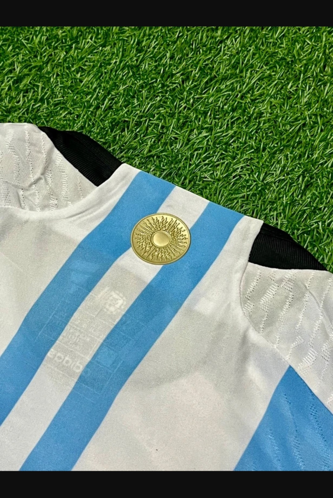 • لوگوها: لوگوی طلایی فدراسیون فوتبال آرژانتین (AFA) همراه با دو ستاره قهرمانی بالای آن و لوگوی آدیداس روی سینه به صورت پرس حرارتی با کیفیت بالا.